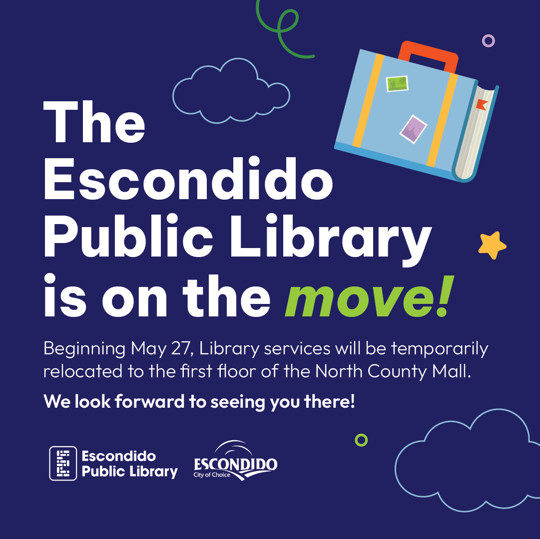 For further details, please visit the Library's relocation information page at https://www.escondido.gov/1249/Relocation or contact the Library directly at 760-839-4683.